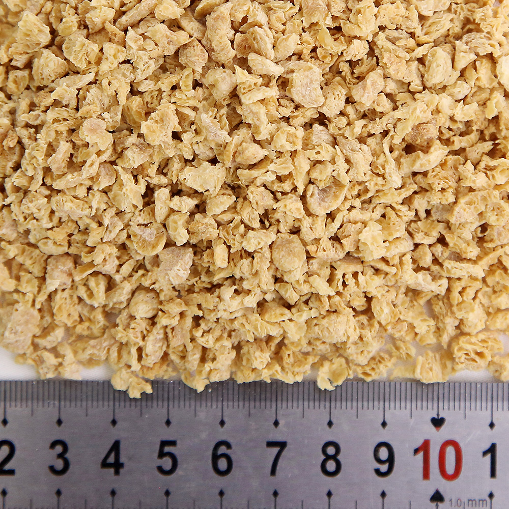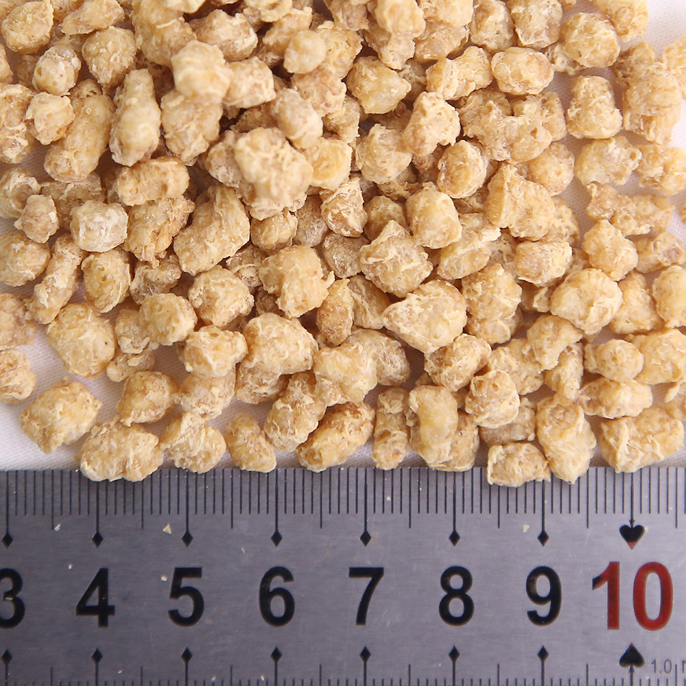 該產(chǎn)品是將分離蛋白、大豆?jié)饪s蛋白、低溫豆粕、谷朊粉、淀粉依產(chǎn)品配方比例經(jīng)擠壓膨化、高溫高壓處理而成,具有良好的吸水性、保油性和類似肉的纖維結(jié)構(gòu),富有咀嚼感,是一種理想的高蛋白肉制品添加物、休閑豆制品的輔料。產(chǎn)品類型包括TW系列、TB系列